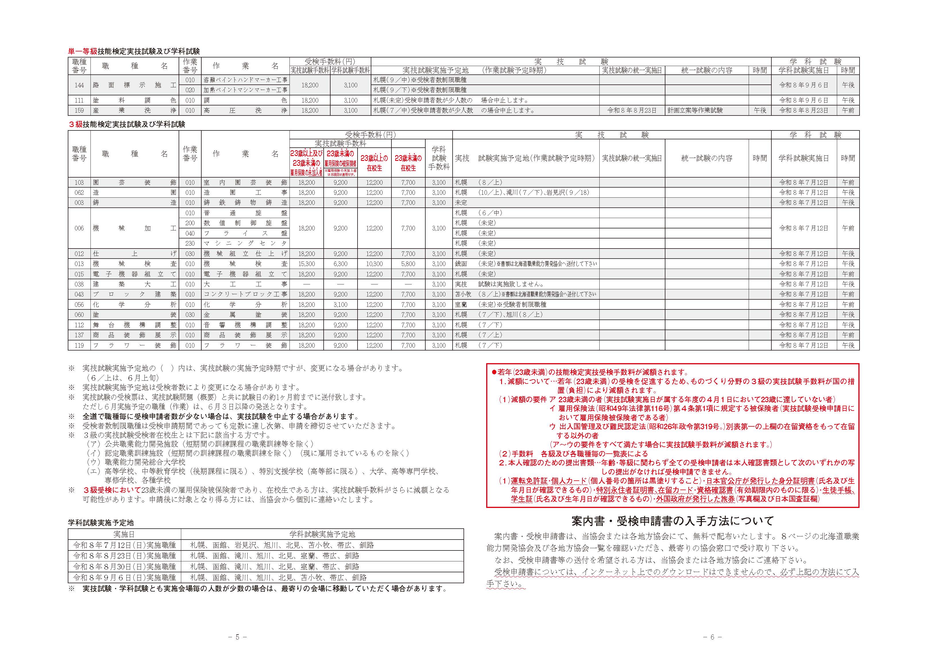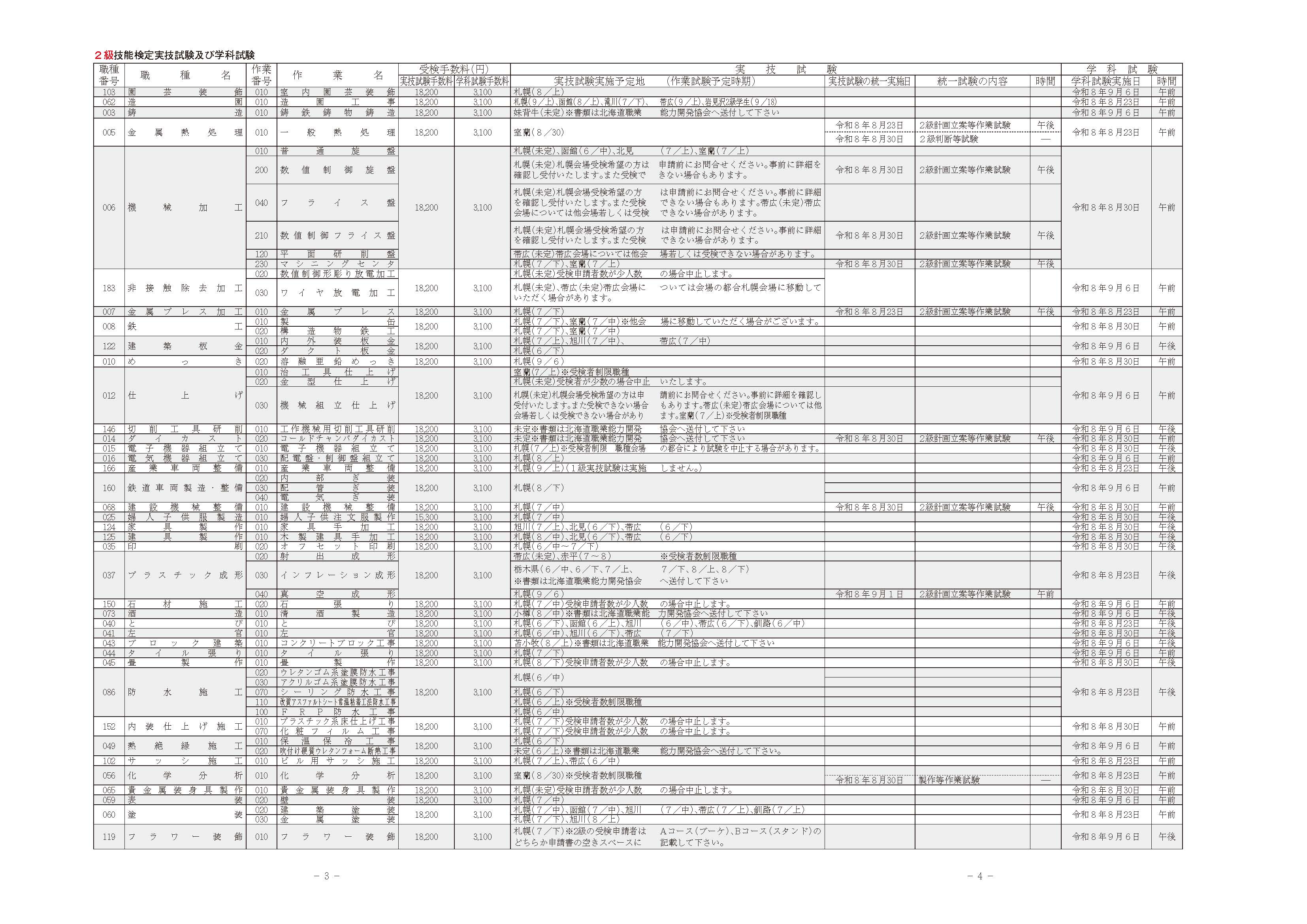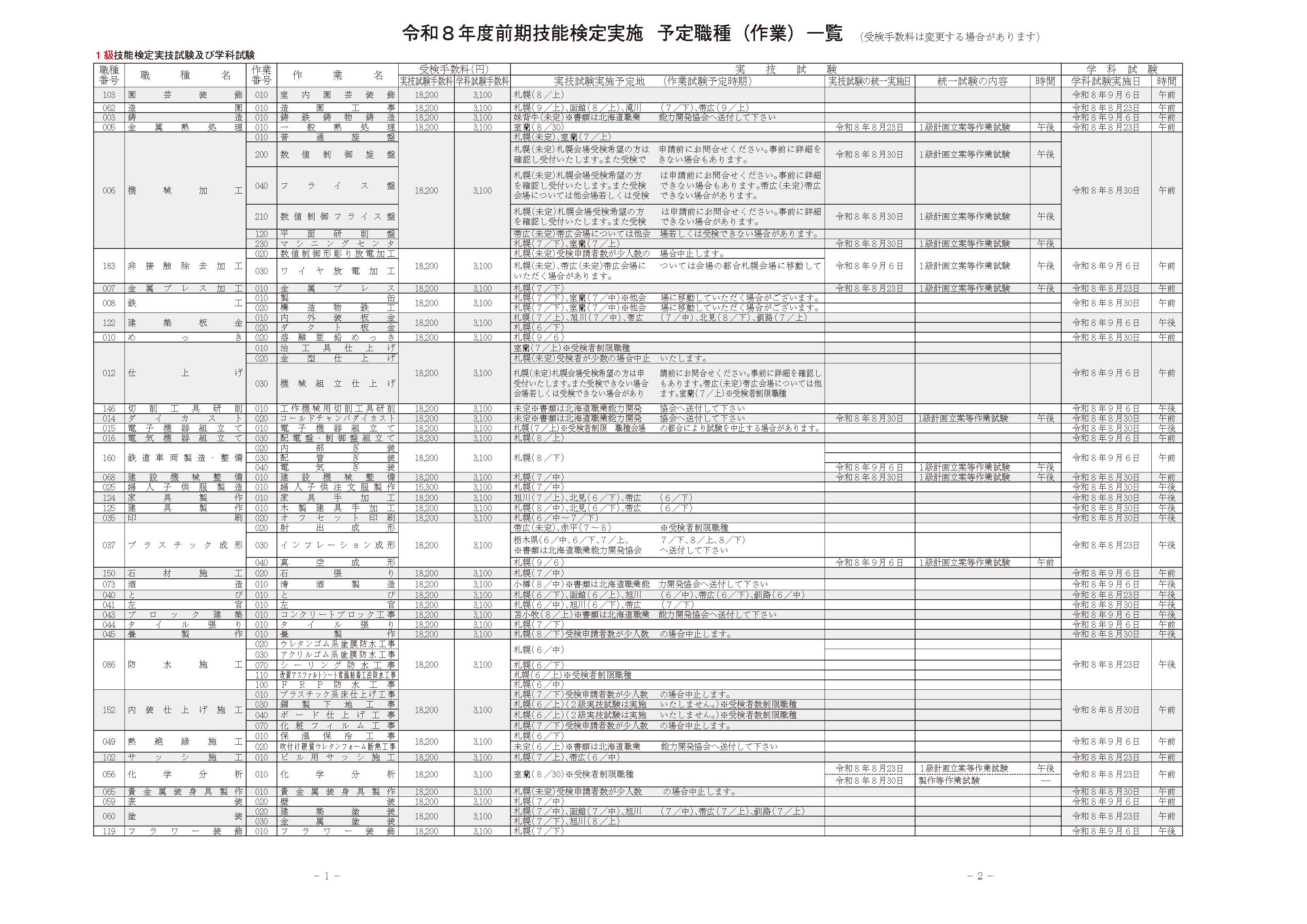 技能検定の実施予定「前期」 ※技能検定お問い合わせ 011-825-2386